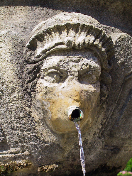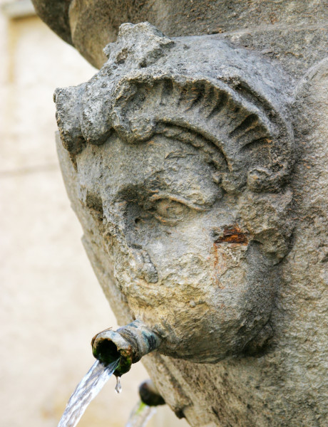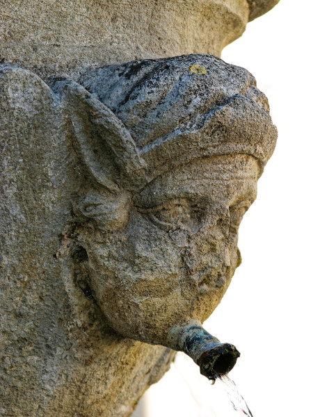 La fontaine séduit par son élégance : son bassin octogonal s’organise autour d’un fût central surmonté d’un réservoir décoré d’écailles. Quatre mascarons, figures mythologiques sculptées, ornent l’ensemble, dont celle du roi Midas, reconnaissable à ses longues oreilles.
