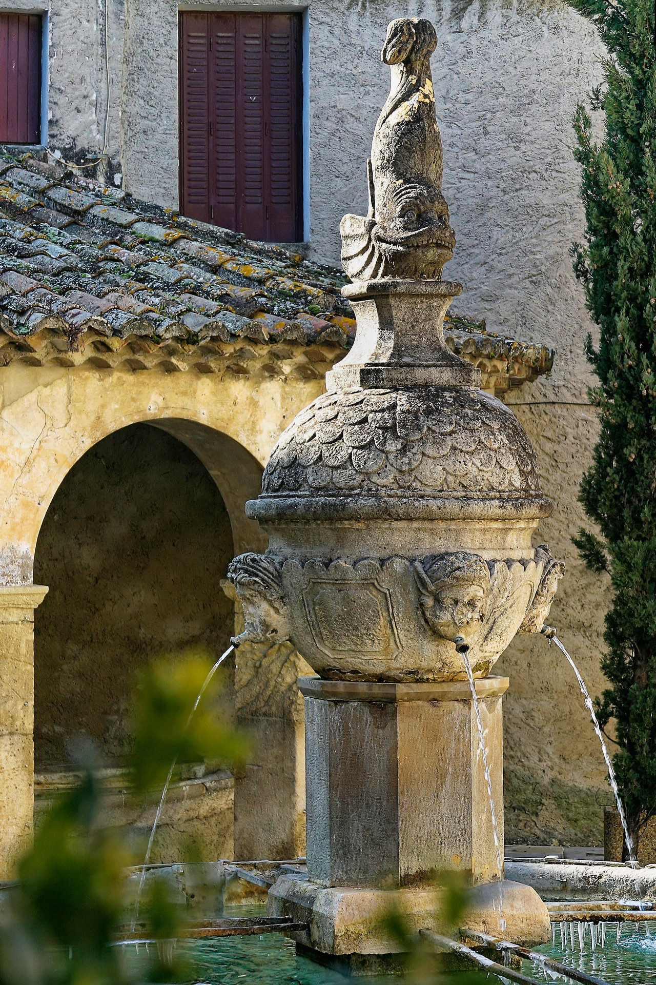 Au sommet, un dauphin domine fièrement la fontaine. Offert par le seigneur du village, Alexis Elzéard de Simiane, il rappelle l’attachement historique de Mollans au Dauphiné.