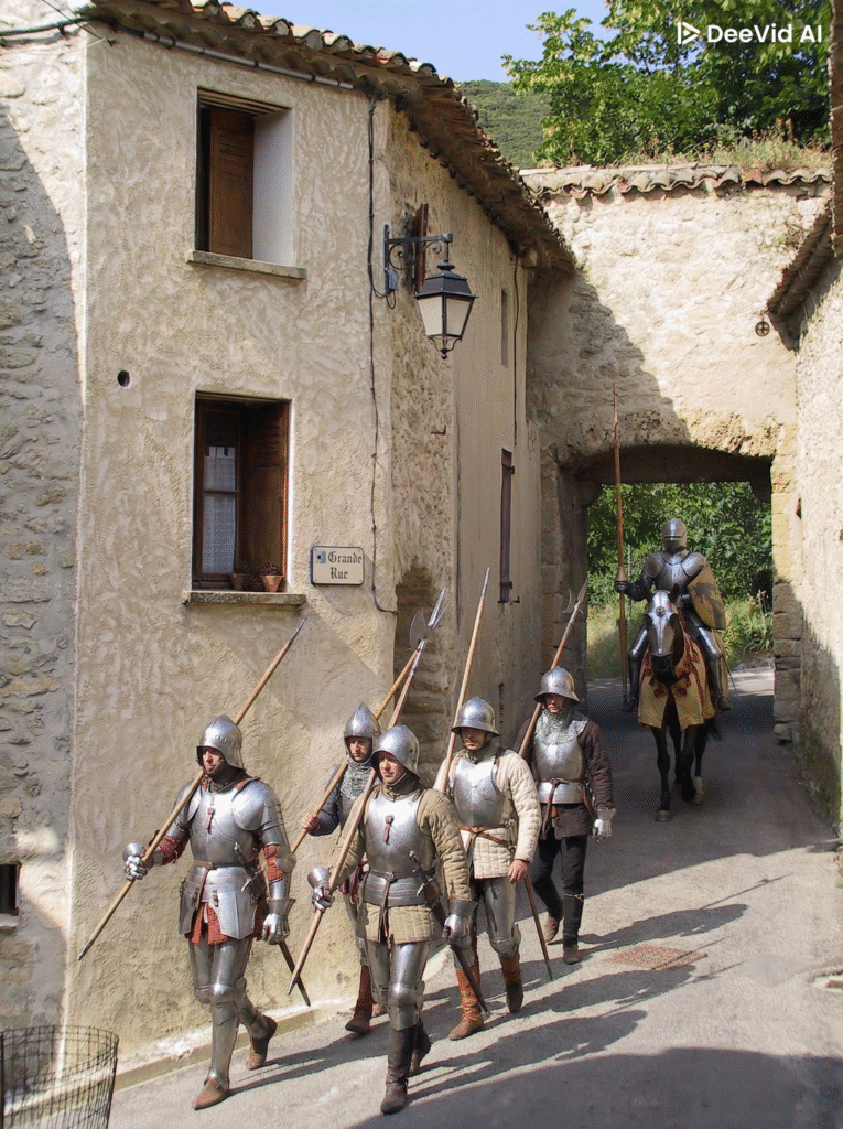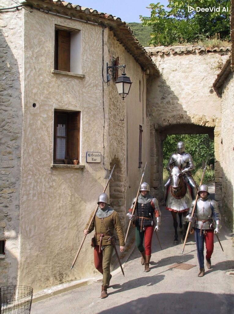 L’intelligence artificielle nous permet de délirer un peu et d’imaginer les temps anciens quand la soldatesque circulait dans les rues de Mollans pour rejoindre la Citadelle, lieu d’hébergement des troupes.