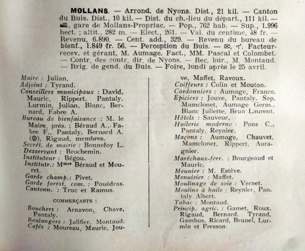 Dans un annuaire des années 1930 on trouve une liste des commerces de Mollans dont on devine encore les boutiques par leur forme caractéristique sur la Place Banche de Cour, la Grande Rue ou à la Bourgade. Mollans ne comptait alors que 762 habitants.